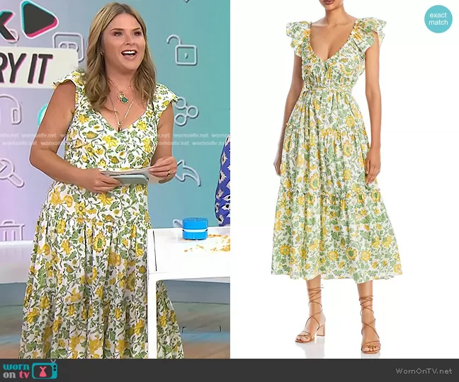 Jenna Bush Hager on Today on NBC was spotted wearing this white floral ruffle dress on Today on Aug 11 2023's episode. Jenna's Dress is the Anastasia Floral Ruched Maxi Dress by Derek Lam 10 Crosby.