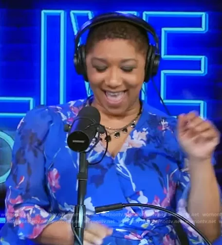 Deja Vu on Live with Kelly and Mark on Disney ABC Home Entertainment was spotted wearing this blue floral print wrap dress on Live with Kelly and Mark on Aug 14 2023's episode. Deja Vu's Dress is the Floral Print Faux Wrap Chiffon Dress by Adrianna Papell.