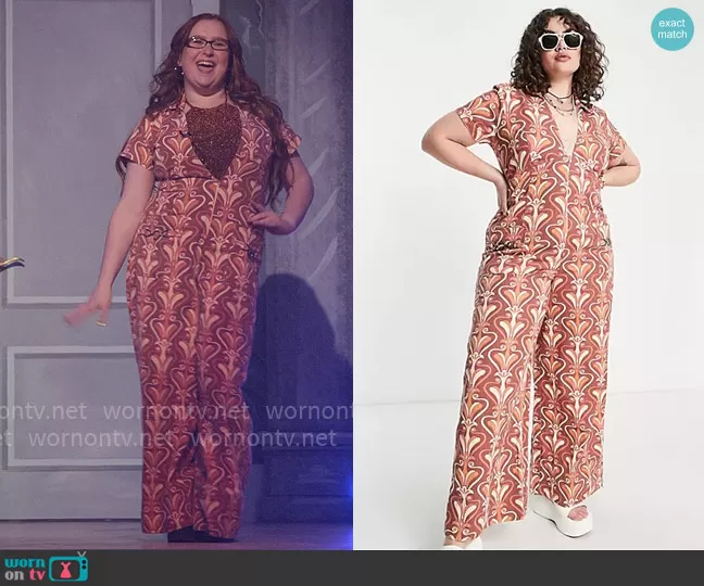 Ashlyn (played by Julia Lester) on High School Musical The Musical The Series on Disney was spotted wearing this orange printed jumpsuit on High School Musical The Musical The Series on episode 'The Night of Nights' (4x07) in Aug 2023. Ashlyn's Jumpsuit is the Twill collar jumpsuit with wide leg in retro swirl print by ASOS Design.