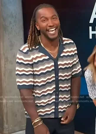 Scott Evans on Access Hollywood on NBC was spotted wearing this striped shirt on Access Hollywood on Aug 15 2023's episode. Scott's Shirt is the Whiteley zig-zag short-sleeved stretch-knit shirt by Reiss.