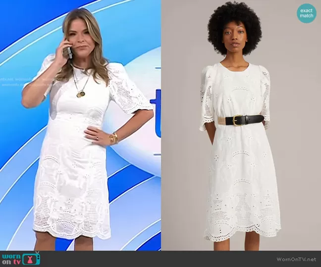 Jenna Bush Hager on Today on NBC was spotted wearing this white eyelet scalloped dress on Today on Aug 15 2023's episode. Jenna's Dress is the Gazzy Dress by Munthe.