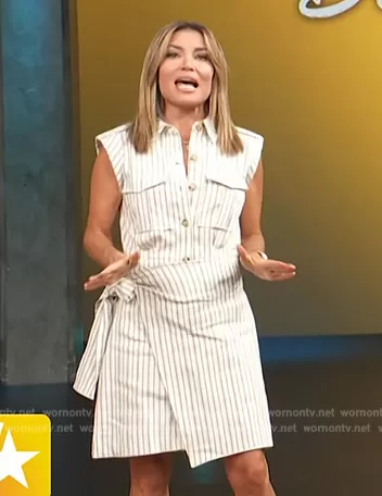 Kit Hoover on Access Hollywood on NBC was spotted wearing this white striped side tie dress on Access Hollywood on Aug 16 2023's episode. Kit's Dress is the Giselle Dress by Derek Lam 10 Crosby.