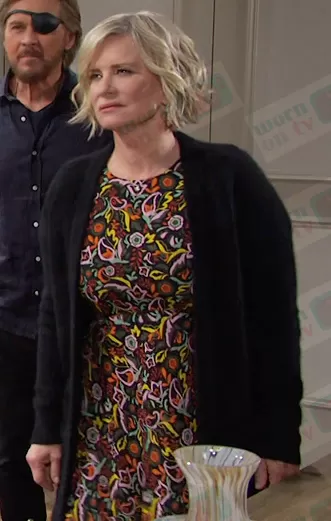 Kayla Brady (played by Mary Beth Evans) on Days of our Lives on Peacock was spotted wearing this black floral dress on Days of our Lives on Aug 18 2023's episode. Kayla's Dress is the Dabney Floral Puff Sleeve High-Low Dress by Ted Baker.