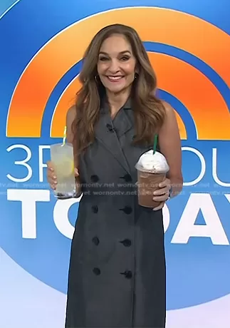 Joy Bauer on Today on NBC was spotted wearing this grey double breasted sleeveless blazer dress on Today on Aug 18 2023's episode. Joy's Dress is the Trench Shirts Dress by Ann Taylor.