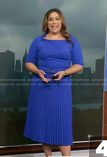 on NBC News Daily on NBC was spotted wearing this blue belted dress on NBC News Daily on Aug 18 2023's episode. 's Top is the Refined Stretch Envelope Neck Top by Ann Taylor . 's Skirt is the Belted Pleated Midi Skirt by Ann Taylor.