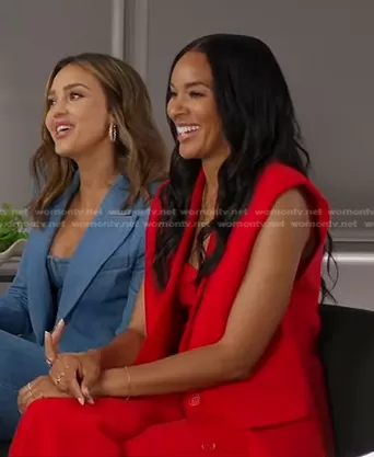 on Good Morning America on ABC was spotted wearing this red sleeveless blazer and pants on Good Morning America on Aug 18 2023's episode. 's Top is the Irena Panelled Bralette by Shona Joy . 's Jacket is the Irena Sleeveless Tailored Blazer by Shona Joy . 's Pants is the Irena Highwaisted Tailored Pant by Shona Joy.