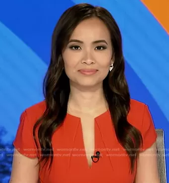 on Good Morning America on ABC was spotted wearing this red v-neck dress on Good Morning America on Aug 18 2023's episode. 's Dress is the Short Sleeve Dart Fit & Flare Dress in Tomato by Elie Tahari.