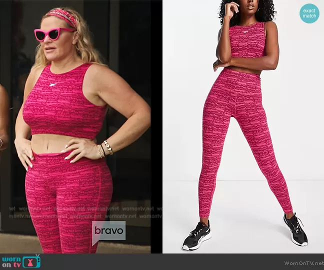 Heather Gay on The Real Housewives Ultimate Girls Trip on Bravo was spotted wearing this pink space dye top and leggings on The Real Housewives Ultimate Girls Trip on episode 'Dangerous Games' (3x04) in Mar 2023. Heather's Top is the MYT cotton crop top in pink by Reebok . Heather's Pants is the MYT cotton leggings in pink by Reebok.