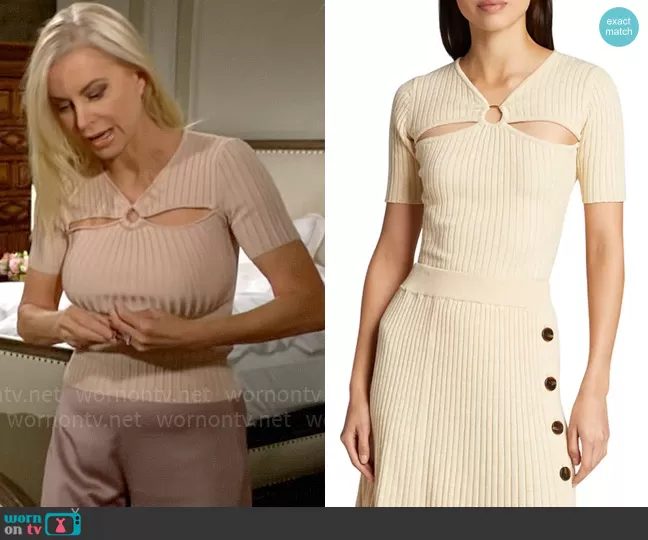 Ashley Abbott (played by Eileen Davidson) on The Young and the Restless on CBS was spotted wearing this cream ring cutout ribbed top on The Young and the Restless on Aug 18 2023's episode. Ashley's Top is the Ary Slit O-Ring Short-Sleeve Top by Anna Quan .