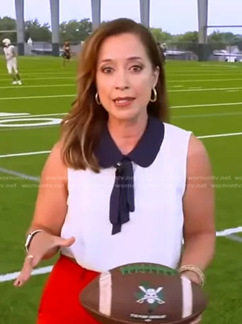 on Good Morning America on ABC was spotted wearing this white contrast collar tie neck top on Good Morning America on Aug 21 2023's episode. 's Top is the Sleeveless Collared Blouse by Cece.