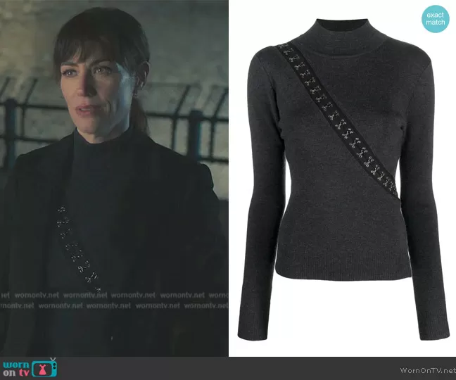 Wendy Rhoades (played by Maggie Siff) on Billions on Showtime was spotted wearing this black hook and eye sweater on Billions on episode 'Tower of London' (7x01) in Aug 2023. Wendy's Sweater is the Hook-detail mock-neck jumper by Monse.