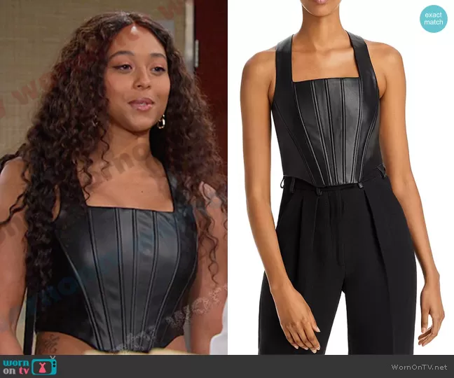 Talia Hunter (played by Aketra Sevellian) on Days of our Lives on Peacock was spotted wearing this black corset top and print jeans on Days of our Lives on Aug 22 2023's episode. Talia's Top is the Farra Faux Leather Corset Top by Aqua . Talia's Pants is the Low-Rise Skinny Jean by BDG.