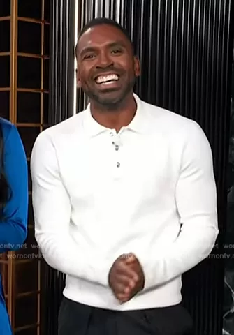 Justin Sylvester on E! News on E! was spotted wearing this white henley polo on E! News on Dec 24 2023's episode. Justin's Top is the Sharp Long Sleeve Polo Shirt by Reiss.