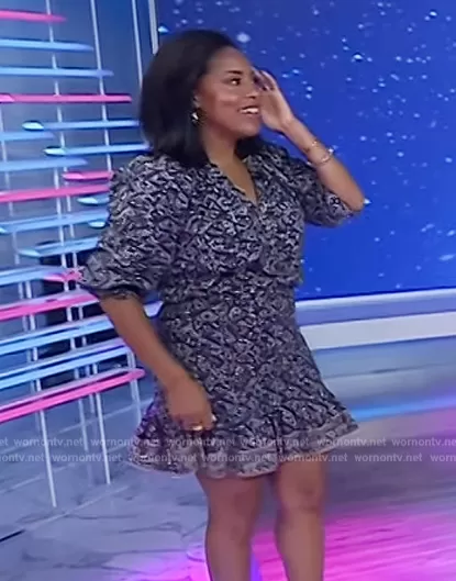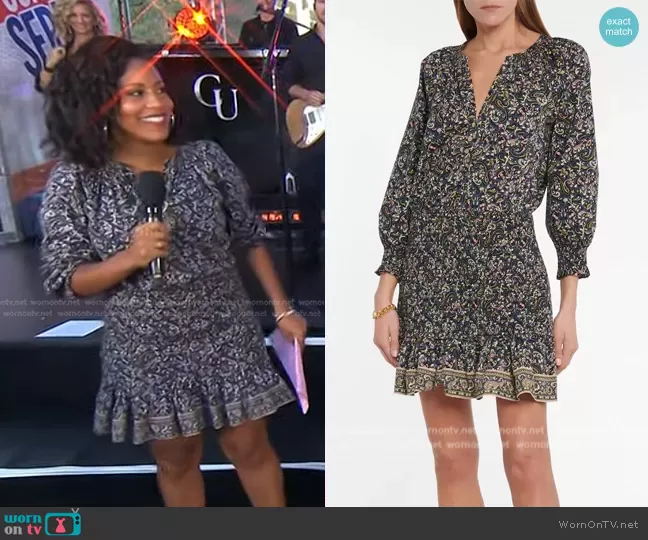 Sheinelle Jones on Today on NBC was spotted wearing this floral print mini dress on Today on Sep 14 2023's episode. Sheinelle's Dress is the Karlina paisley cotton minidress by Veronica Beard.