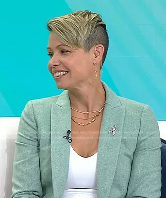 on Today on NBC was spotted wearing this green herringbone blazer on Today on Aug 22 2023's episode. 's Jacket is the Herringbone Wool-Blend Holland Blazer by J. Crew.