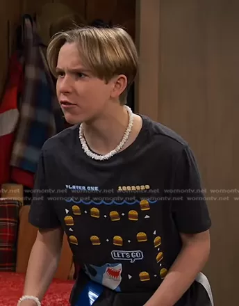 Jake (played by Luke Busey) on Bunkd on Disney was spotted wearing this black burger and shark print tee on Bunkd on episode 'Hot Couture' (7x05) in Aug 2023. Jake's Shirt is the Boy's Short Sleeve Pac-Man Shark Graphic T-Shirt by Cat & Jack.