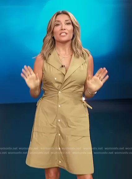Kit Hoover on Access Hollywood on NBC was spotted wearing this khaki button down dress on Access Hollywood on Aug 23 2023's episode. Kit's Dress is the Serena Lace Up Shirt Dress by Derek Lam 10 Crosby.