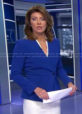 Norah O'Donnell on CBS Evening News on CBS was spotted wearing this blue peplum jacket on CBS Evening News on Aug 23 2023's episode. Norah's Jacket is the Clever Crepe Claremont Jacket in Cobalt Blue by The Fold.