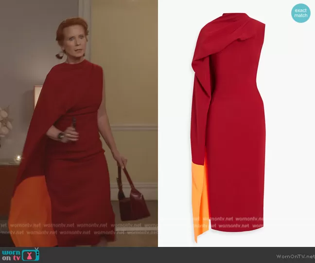 Miranda Hobbs (played by Cynthia Nixon) on And Just Like That on HBO was spotted wearing this red drape colorblock dress on And Just Like That on episode 'The Last Supper Part Two: Entrée' (2x11) in Aug 2023. Miranda's Dress is the Draped two-tone crepe midi dress by Roksanda.
