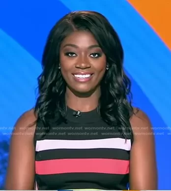 on Good Morning America on ABC was spotted wearing this multicolor striped dress on Good Morning America on Oct 20 2023's episode. 's Dress is the Sleeveless Stripe Sweater Dress by New York & Company.
