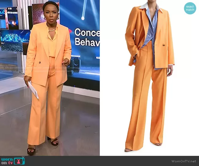 Zinhle Essamuah on NBC News Daily on NBC was spotted wearing this orange blazer and wide leg pants on NBC News Daily on Jul 24 2025's episode. Zinhle's Jacket is the Emmy Double Breasted Blazer by Reiss . Zinhle's Pants is the Emmy Wide-Leg Trousers by Reiss.