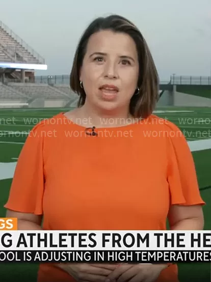 on CBS Mornings on CBS was spotted wearing this orange top on CBS Mornings on Aug 25 2023's episode. 's Top is the Mixed Media Angel Sleeve Top in Summer Orange by Ann Taylor .