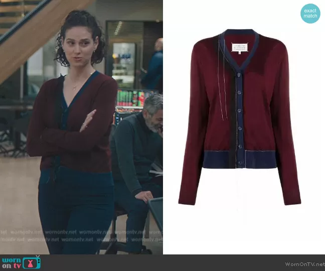 Eva Victor (played by Rian) on Billions on Showtime was spotted wearing this maroon and navy cardigan on Billions on episode 'Winston Dick Energy' (7x03) in Aug 2023. Rian's Sweater is the Two-tone stitch-detail cardigan by Maison Margiela.
