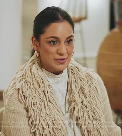 Jessel Taank on The Real Housewives of New York City on Bravo was spotted wearing this beige fringe cardigan on The Real Housewives of New York City on episode 'You Wreath What You Sow' (14x07) in Aug 2023. Jessel's Sweater is the Fauna Fringed Rib Knit Cardigan by Cult Gaia.