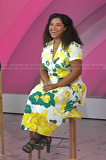 on Today on NBC was spotted wearing this green and yellow floral midi dress on Today on Aug 28 2023's episode. 's Dress is the Short-Sleeve Flounce Dress in Yellow Motif by Plenty by Tracy Reese.