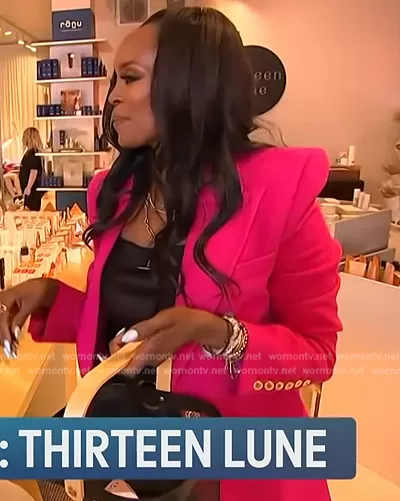 on Access Hollywood on NBC was spotted wearing this pink blazer on Access Hollywood on Aug 27 2023's episode. 's Blazer is the Double-Breasted Blazer by Sergio Hudson.