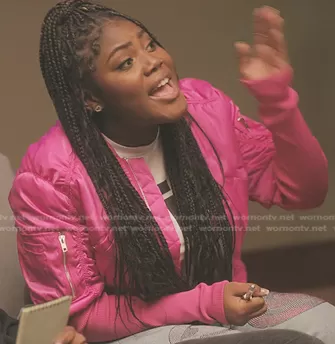 Lynae (played by Zaria Imani Primer) on The Chi on ShowTime was spotted wearing this pink cropped bomber jacket on The Chi on episode 'ReUp' (6x04) in Aug 2023. 's Jacket is the Babbs Skinny Arm Bomber Jacket by Akira.