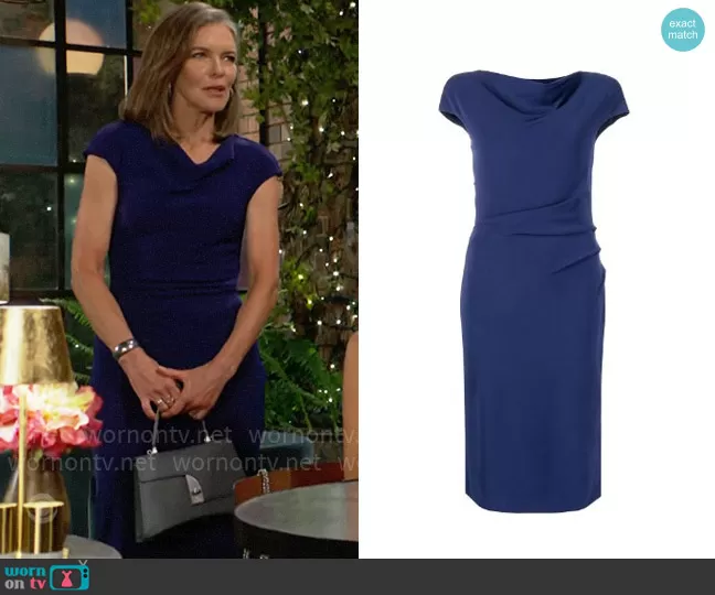 Diane Jenkins (played by Susan Walters) on The Young and the Restless on CBS was spotted wearing this blue cap sleeve dress and grey bag on The Young and the Restless on Aug 29 2023's episode. Diane's Dress is the Drape Detail Knitted Dress by Paule Ka . Diane's Bag is the Arco Small Satchel by Arcadia.