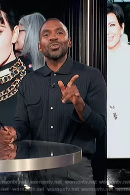 Justin Sylvester on E! News on E! was spotted wearing this black stripe long sleeve shirt on E! News on Aug 29 2023's episode. Justin's Shirt is the Lightweight sweatshirt with all-over jacquard motif jersey by Emporio Armani.
