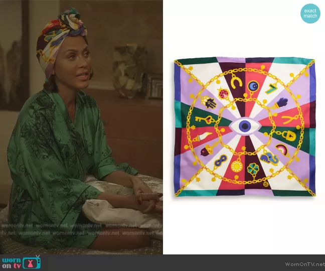 Lisa Todd Wexley (played by Nicole Ari Parker) on And Just Like That on HBO was spotted wearing this printed robe and scarf on And Just Like That on episode 'The Real Deal' (2x02) in Jun 2023. Lisa's Robe is the Chez Moi Gown by Dior . Lisa's Scarf is the Lucky Charms by Deseda .