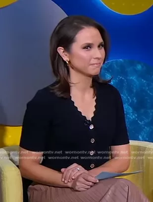 Elizabeth Schulze on Good Morning America on ABC was spotted wearing this black scalloped cardigan on Good Morning America on Mar 22 2024's episode. Elizabeth's Sweater is the Cecil Cardigan by Sandro.