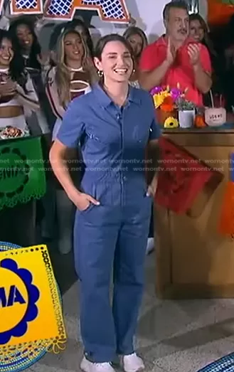 on Good Morning America on ABC was spotted wearing this blue short sleeve denim jumpsuit on Good Morning America on Aug 30 2023's episode. 's Jumpsuit is the Solid Color TRF Denim Jumpsuit by Zara.