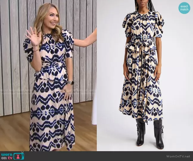 Lori Bergamotto on Good Morning America on ABC was spotted wearing this beige tie dye puff sleeve dress on Good Morning America on Aug 30 2023's episode. Lori's Dress is the Marion Dress in Nimbus by Ulla Johnson.