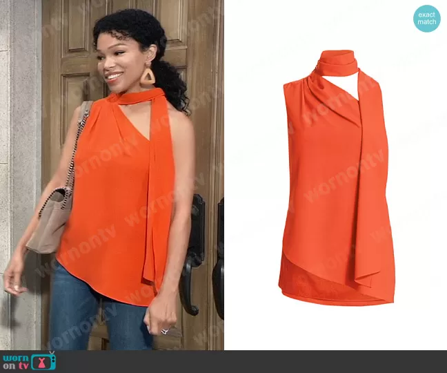 Portia Robinson (played by Brook Kerr) on General Hospital on ABC was spotted wearing this orange one-shoulder top on General Hospital on Aug 30 2023's episode. Portia's Top is the Scarf-Neck Top by Halston . Portia's Bag is the Edie Suede Woven Chain Flap Shoulder Bag by Rebecca Minkoff.