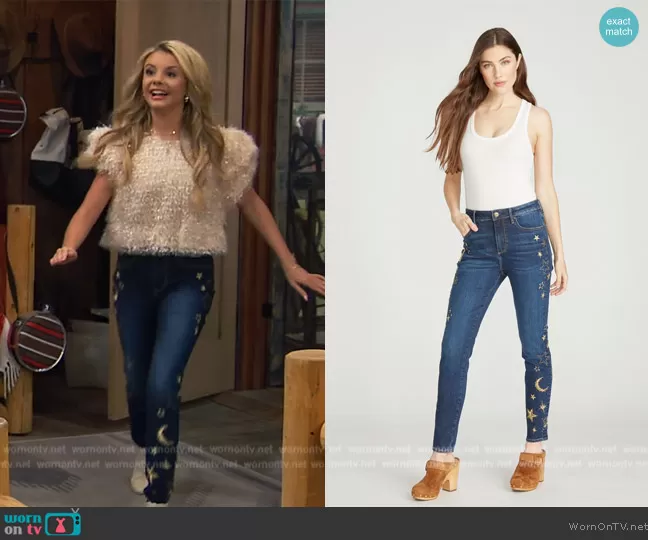 Destiny Baker (played by Mallory James Mahoney) on Bunkd on Disney was spotted wearing this star embellished jeans on Bunkd on episode 'What About Barb?' (7x06) in Aug 2023. Destiny's Pants is the Jackie High Rise Skinny - Celestial Studded by Driftwood Jeans.