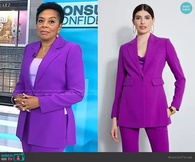 on Today on NBC was spotted wearing this purple side slit blazer and pants on Today on Aug 30 2023's episode. 's Jacket is the Side Slit Blazer in Wild Berry by Elie Tahari . 's Pants is the Fit & Flare Pant in Wild Berry by Elie Tahari.