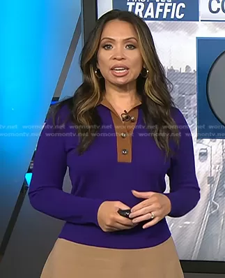 Adelle Caballero on Today on NBC was spotted wearing this purple contrast collar polo sweater on Today on Aug 30 2023's episode. Adelle's Sweater is the Wool Polo Sweater by Tory Burch.