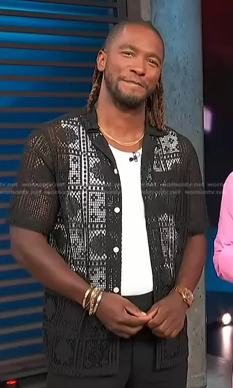 Scott Evans on Access Hollywood on NBC was spotted wearing this black crochet lace shirt on Access Hollywood on Aug 30 2023's episode. Scott's Shirt is the Llonga Crochet Lace Floral Shirt by All Saints.