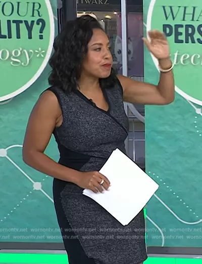 Sheinelle Jones on Today on NBC was spotted wearing this gray cross front dress on Today on Aug 31 2023's episode. Sheinelle's Dress is the Cross Front Dress by Elie Tahari.