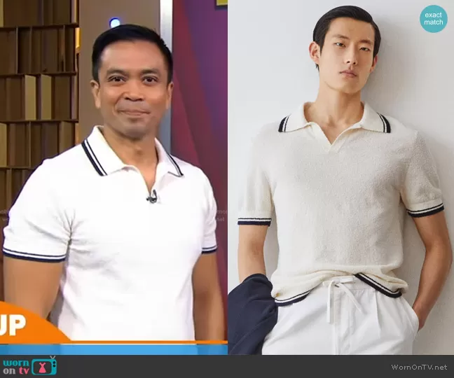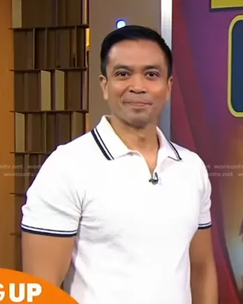 on Good Morning America on ABC was spotted wearing this white contrast trim polo shirt on Good Morning America on Aug 30 2023's episode. 's Shirt is the Tipped Boucle Montauk Polo in Bisque by Todd Snyder.