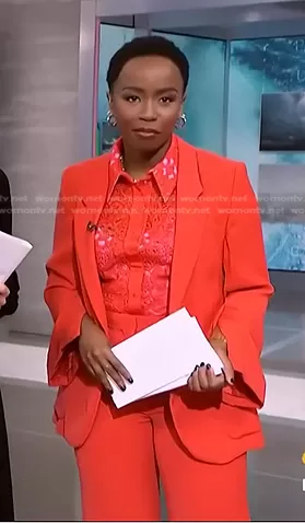 Zinhle Essamuah on NBC News Daily on NBC was spotted wearing this Zinhle’s red lace shirt and blazer on NBC News Daily on Aug 31 2023's episode. Zinhle's Top is the The Founder Collared Lace Woven Top by Karen Millen . Zinhle's Jacket is the Maia Blazer in Coral by Reiss . Zinhle's Pants is the Maia Wide Leg Trousers by Reiss.