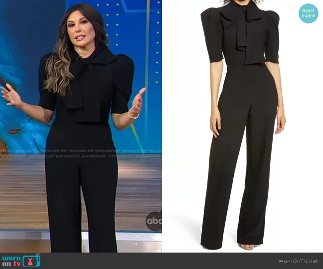 on Good Morning America on ABC was spotted wearing this black tie neck jumpsuit on Good Morning America on Sep 04 2023's episode. 's Jumpsuit is the Ara Jumpsuit by Black Halo.