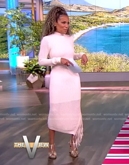 Sunny Hostin on The View on ABC was spotted wearing this white crochet knit fringe dress on The View on Sep 05 2023's episode. Sunny's Dress is the Gilda Pointelle Midi Dress with Fringe by Simkhai.