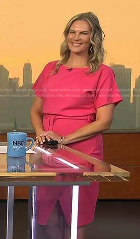 on Today on NBC was spotted wearing this pink tie waist dress on Today on Sep 05 2023's episode. 's Dress is the Textured Knit Self-Tie Waist Faux Wrap Dress in Hot Pink by Kensie.
