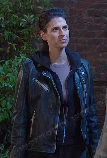 (played by ) on Days of our Lives on Peacock was spotted wearing this Black leather moto jacket on Days of our Lives on Sep 06 2023's episode. 's Jacket is the Sofia Leather Jacket by Mauritius.