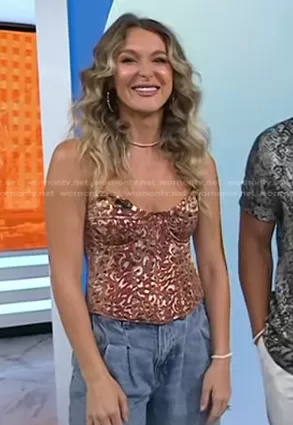 on Today on NBC was spotted wearing this metallic animal print top on Today on Sep 06 2023's episode. 's Top is the Leopard Print Pointed Top Edge Corset Top by Pretty Little Thing.